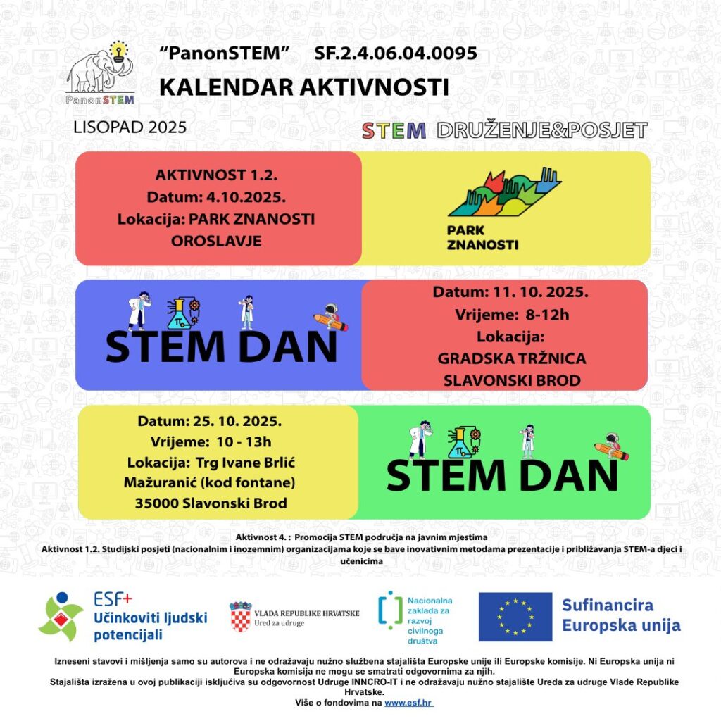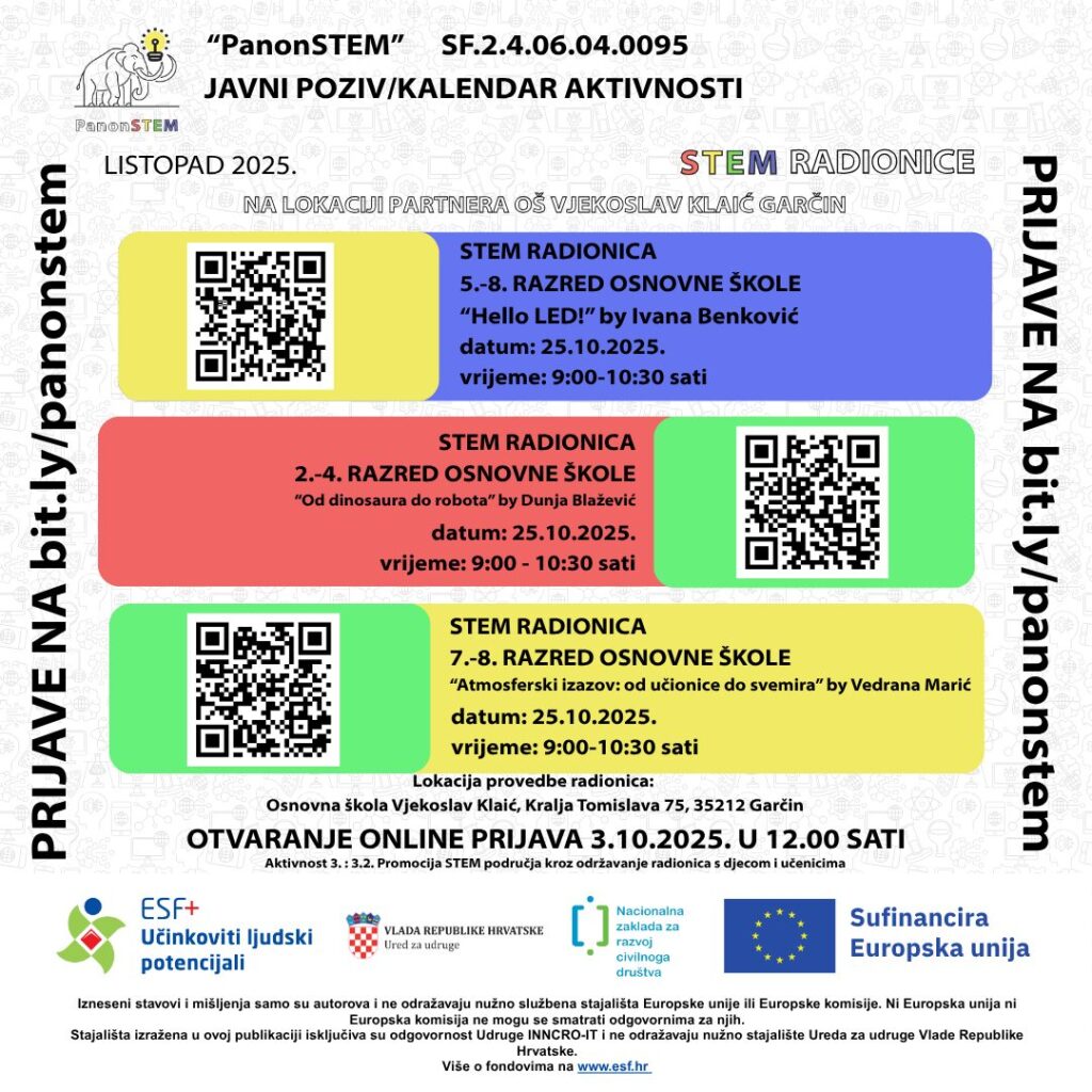 Kao jedna od partnerskih ustanova na projektu “PanonSTEM” , s ponosom objavljujemo javni poziv sa kalendarom aktivnosti i pozivamo sve zainteresirane polaznike, roditelje, članove zajednice – da se uključe u nadolazeće besplatne STEM radionice i aktivnosti.