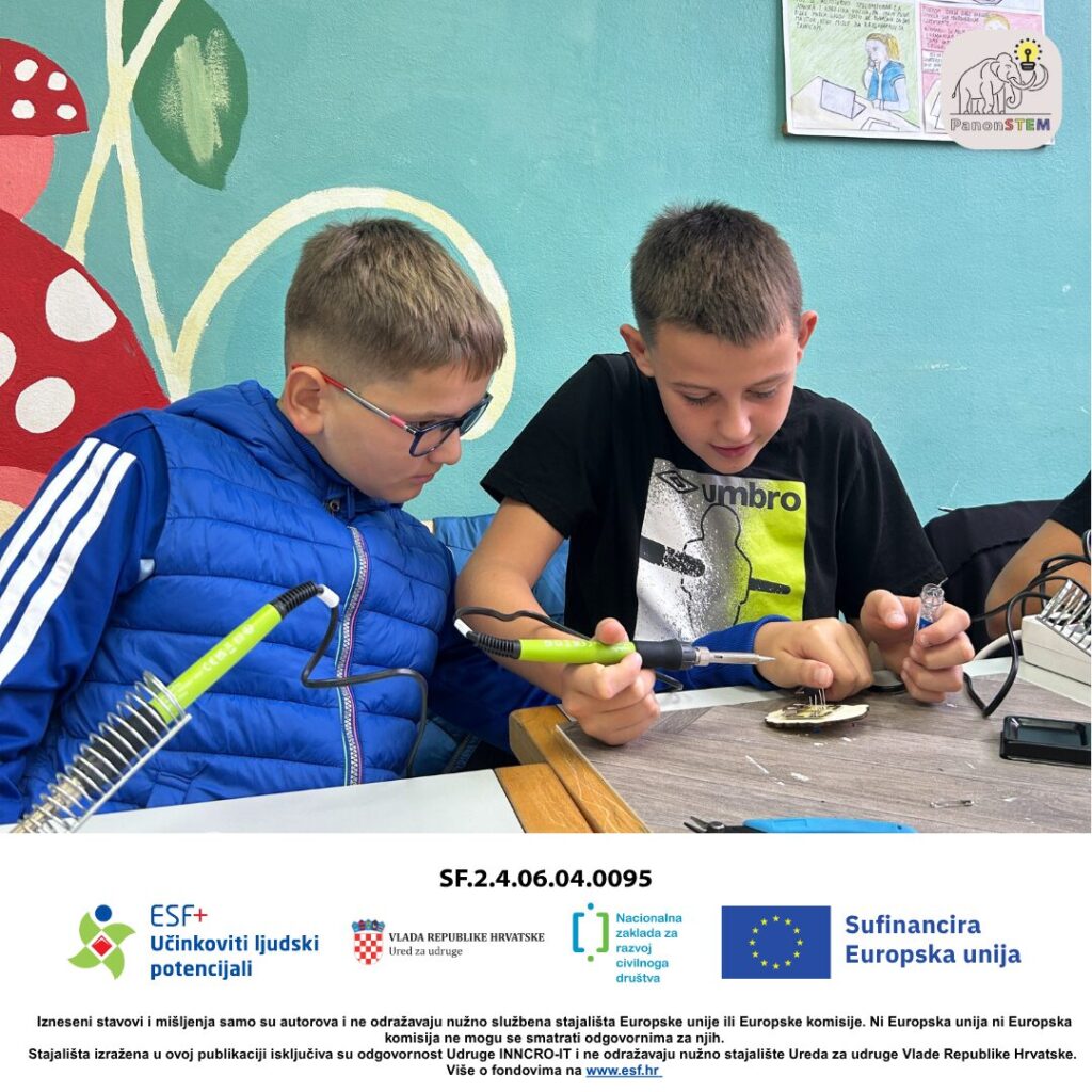 U drugom dijelu radionice polaznici su se upoznali s osnovnim elektroničkim komponentama i uspješno savladali prve korake u lemljenju. Zalemljeni su prvi kontakti, spojeni prvi elementi, a svaki je učenik izradio svoj funkcionalni svjetleći badge.